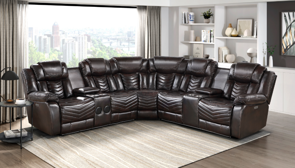 Transform your entertainment space with this 3-piece power reclining sectional, designed for ultimate comfort, technology, and cinematic luxury. Featuring power reclining seats, built-in Bluetooth speakers and subwoofer, and vibrant LED lighting, this sectional delivers an immersive home theater experience like no other. The spacious seating is upholstered in premium faux leather, offering a sleek and durable design that complements any modern living space. Integrated center consoles with cup holders and storage compartments keep essentials within reach.