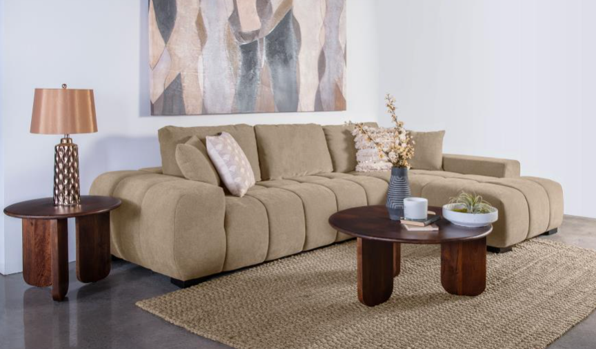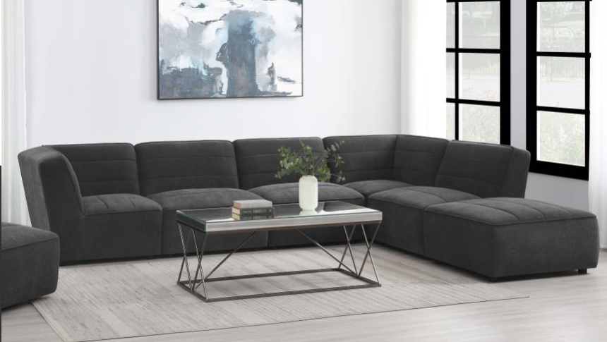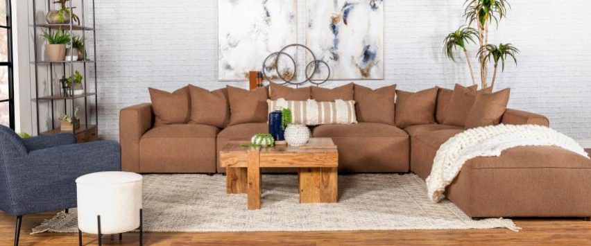 Combine this armless chair with the corner and ottoman pieces of this sectional to make it fit your room. The warm latte and black color scheme makes this thickly padded, comfy sectional look like the perfect place to relax with some friends.