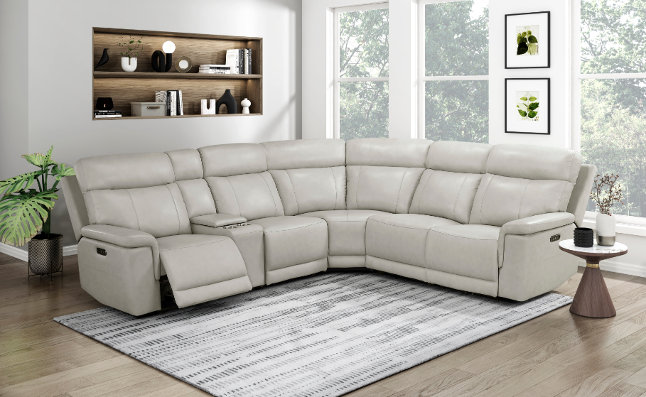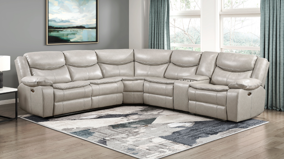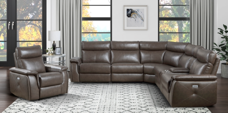 Providing ample seating for your friends and family is the Maroni Collection. The classic sectional shape features an armless chair, corner seat, console – with hidden storage and cupholders – which are book-ended by USB port enhanced end power recliners. Taupe top-grain leather covers the collection where your body touches with faux leather covering the remaining areas. The power reclining mechanism brings you to your desired position with a touch of the button.