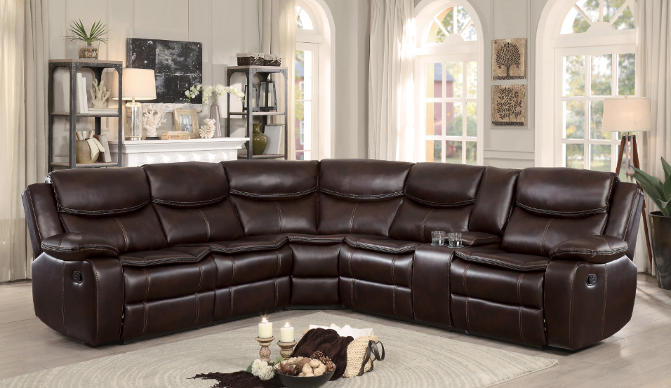 Features reclining capabilities and thick end armrests that elbows sink into. Console features two cup holders and opens up to a roomy storage space. Entire piece is sumptuously wrapped in regal brown leather-like upholstery