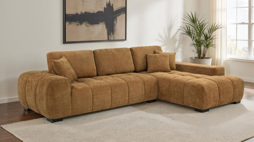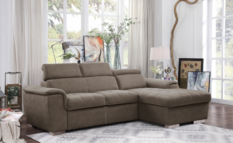 Expanding your seating area to include functional sleep space, the Waitsfield Collection is a versatile addition to your home. Sand-hued textured fabric upholstery covers the sectional with stitch tufting lending a decorative touch. The right-side 2-seater features a pull-out bed while the left-side chaise has a lift-top hidden storage unit beneath the seating area.