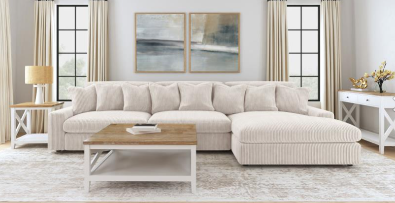 Plush and welcoming, the seat and back cushions of the included sofa and loveseat are detailed with a bright and stylish stitching. Sit back and relax in the softness of the arm cushions and built-in pillowy head rests. Clean and open, the silhouette looks great in any room with a television.