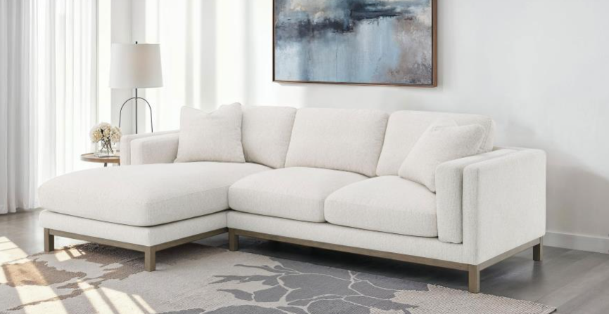 Upholstered in a light fabric, subtle textures elevate the simplicity of the cushions and silhouette. Elongated and clean, the cushions and arms combine in smooth lines. Store extra throw blankets and pillows in the storage space beneath the chaise. Open and sleek metal legs help to give this sofa its contemporary aura.